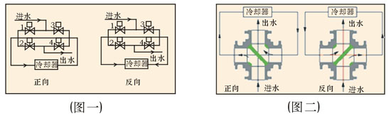 该四通换向球阀,一 阀实现正反供水切换,每转90 ,供水方式切换一次,以前需四个阀门,供水时阀1、4 开启,阀2、3关闭;反向供水时阀2、3开启,阀1、4 关闭(图一),现用一台四通球阀(图二)替代,操作方便。